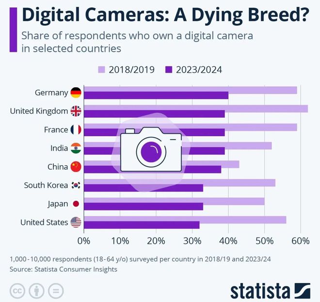 国外媒体Statista最近贴出几张相机出货量的数据图表,显示过去几年与今年的销售情况对比。可以明显发现,2023/2024年的相机销售量是不如过去的。 根据Statista Consumer Insights的数据,如下图所示,在过去...
