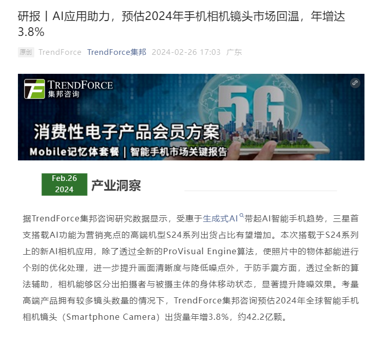 TrendForce集邦咨询:AI应用助力预估2024年手机星空体育官网相机镜头市场回温年增达38%