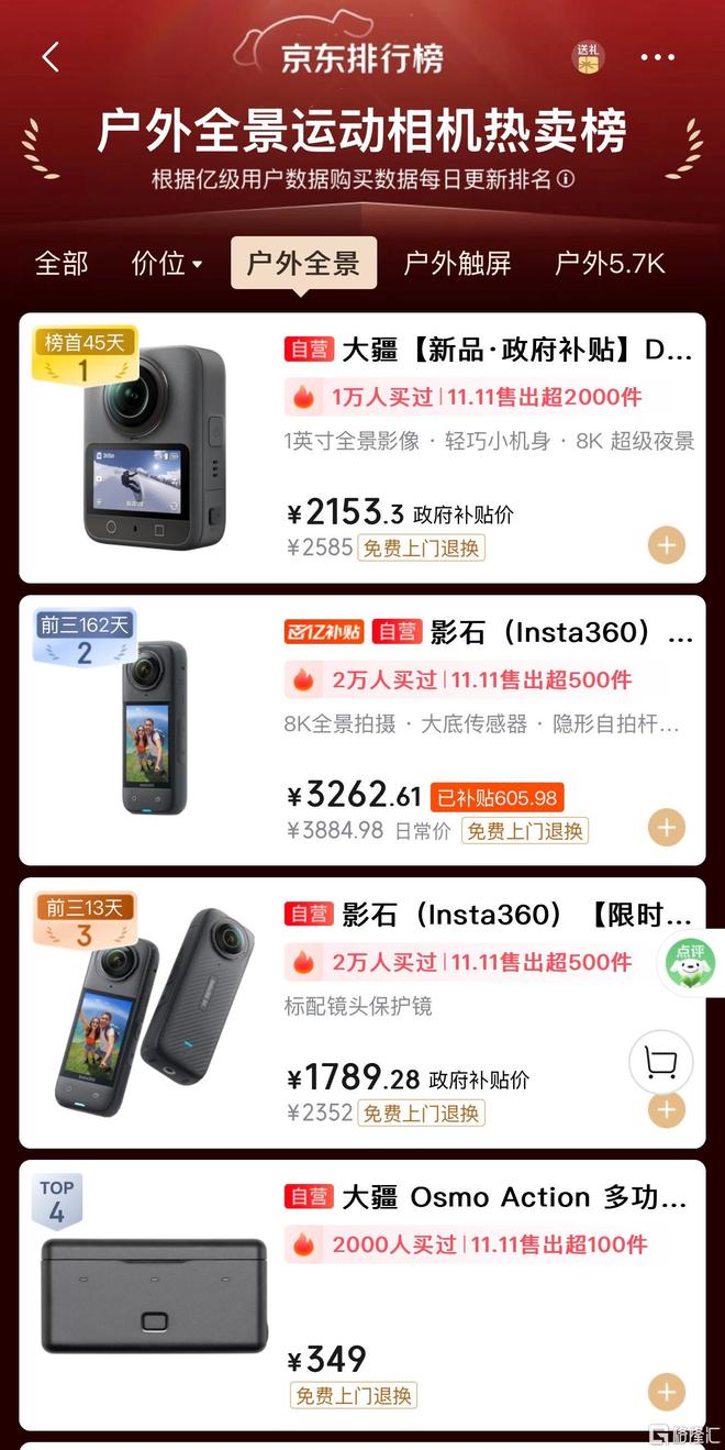 大疆全景相机、运动相机全面霸榜京东热卖榜