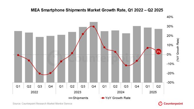 Counterpoint:2025年Q2中东非地区智能手机出货量同比增长3%